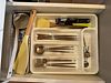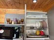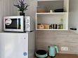 Кухонная мебель: столы, стулья, шкафы для хранения продуктов и посуды. Бытовая техника: холодильник, микроволновая печь, плита, чайник, кофеварка. Полностью укомплектованная посуда: кастрюли, сковородки, тарелки, чашки, столовые приборы.