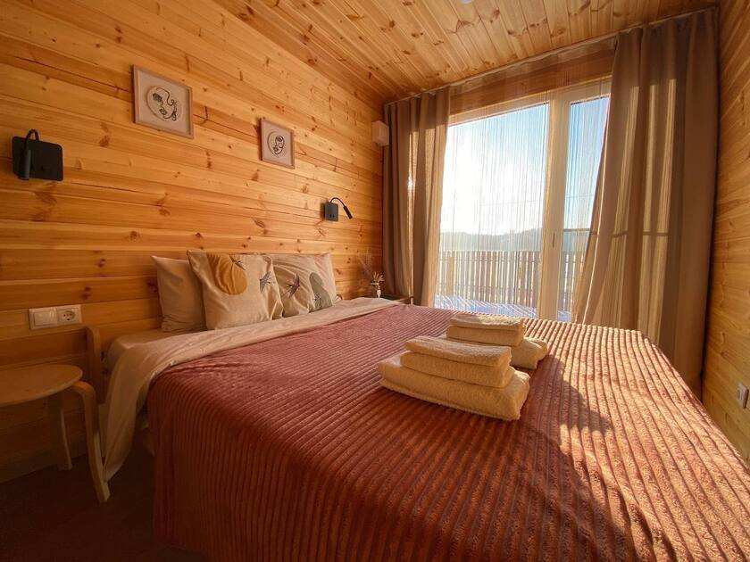Домик рассчитан на проживание двух взрослых с двумя детьми. Стоимость проживания включает в себя полотенца и средства личной гигиены. Также предоставляется трансфер до источника. Купель и баню можно заказать за отдельную плату.