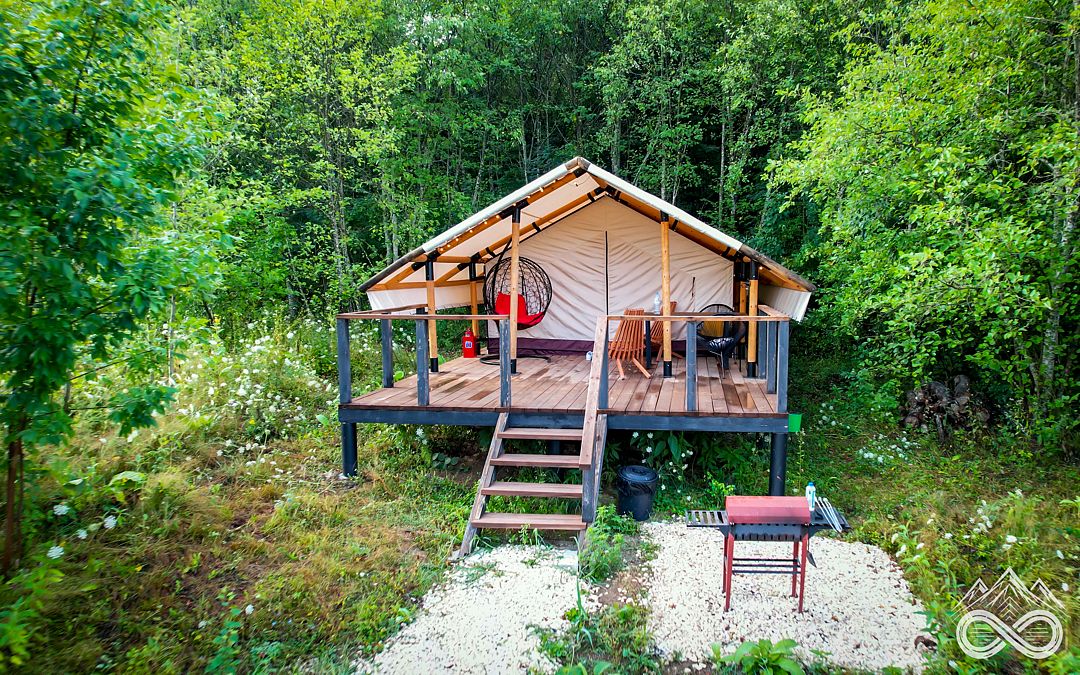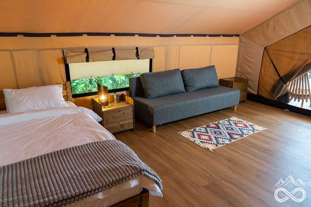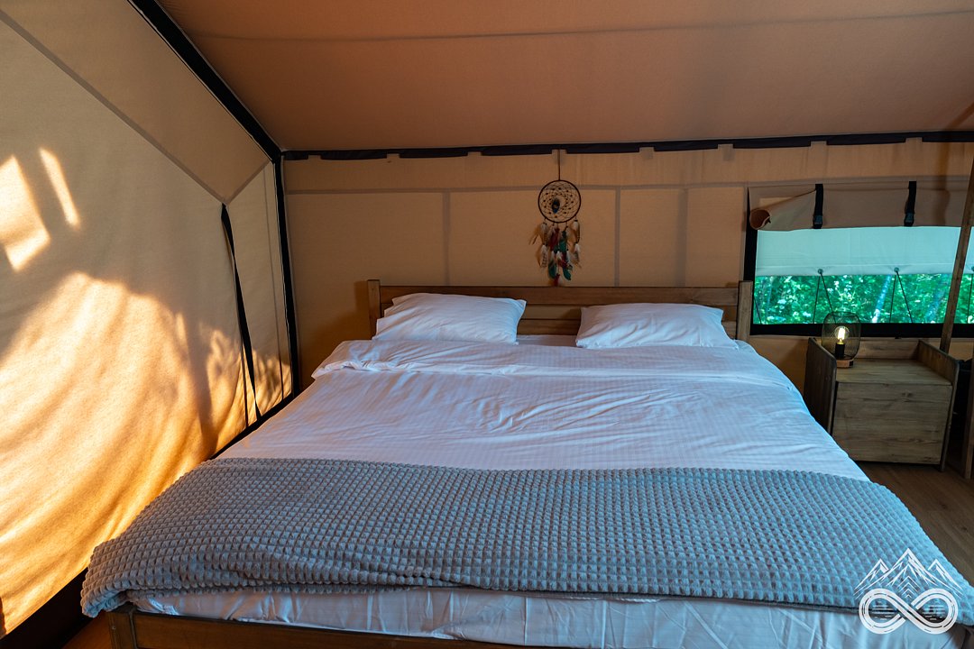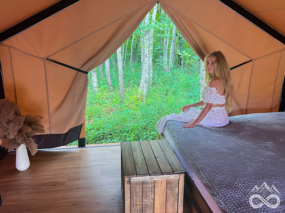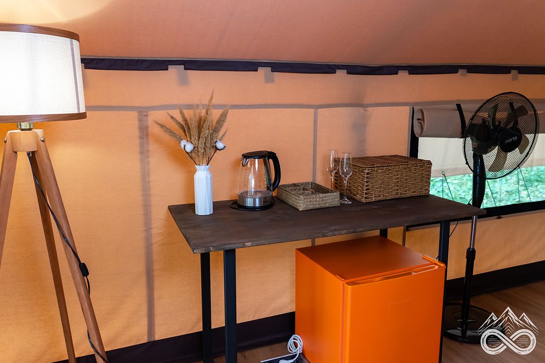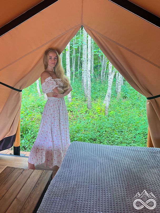 Каждый сафари-тент — это уютное место, где можно наслаждаться красотой природы и всем комфортом, присущим гостинице. На краю леса, с собственной террасой и мангальной зоной, эти домики обеспечивают уединение и живописные виды. После активного дня можно собраться на общей кухне-гостиной с дровяной печью для уютных бесед или отдохнуть у большой костровой зоны, где вечерами собираются гости, делясь впечатлениями и искренними моментами.