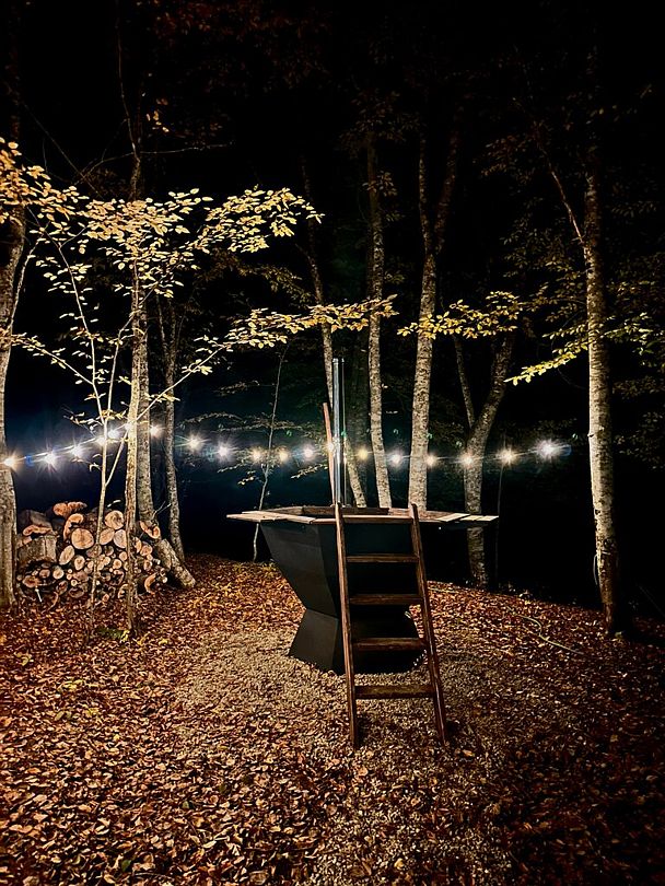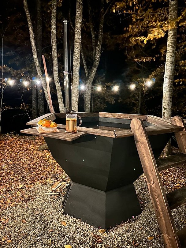 Гости могут насладиться расслабляющим отдыхом в великолепном банном чане, который расположен на опушке леса. Вечером, когда зажигаются гирлянды, он становится еще более уютным, превращая лес в настоящий сказочный мир.
