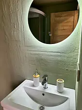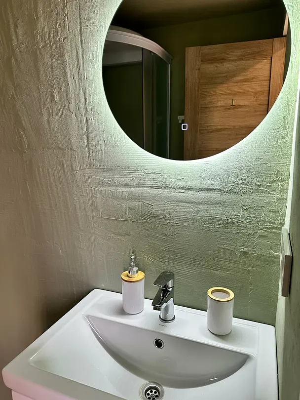 Санузел находится в отдельном санитарном блоке, для каждого домика полноценный отдельный санузел запирающийся на ключ. Отдельная комната для каждого домика с душем и горячей водой, раковиной, зеркалом.