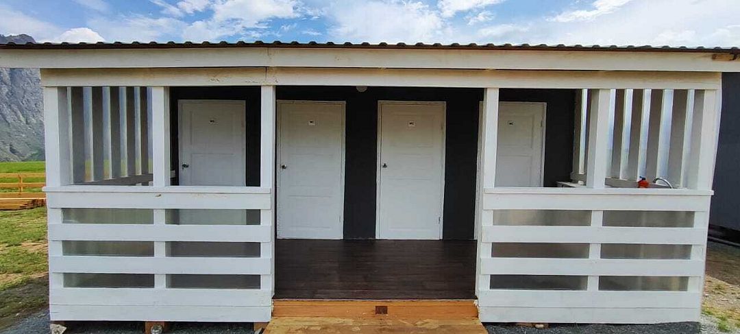 Дом площадью 28 м² (с открытой террасой), с высокими потолками. Двуспальная кровать и полуторная кровать, столик складной, модуль для одежды с плечиками. Чайник электрический, чайный набор (чашки, ложки), бокалы для воды.