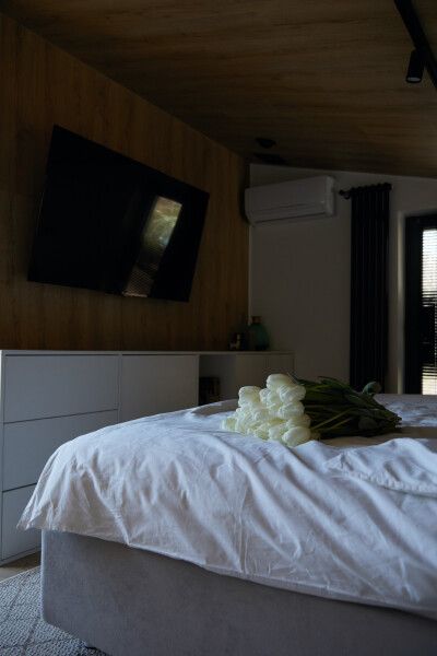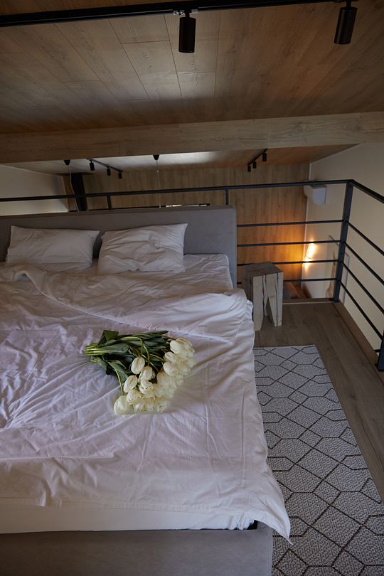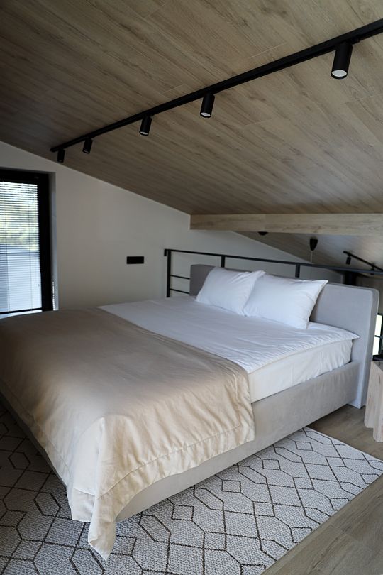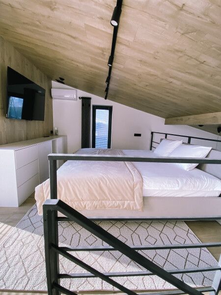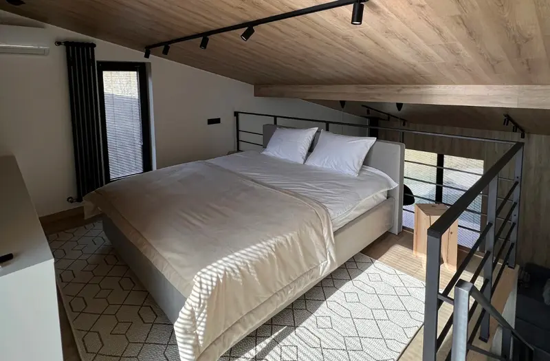 Второй этаж оснащён двухспальной кроватью с ортопедическим матрасом для более комфортного, спокойного сна.