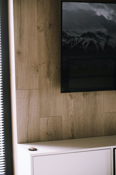Возле кровати стоят комод и тумбы, над тумбой напротив кровати размещён ЖК-телевизор.