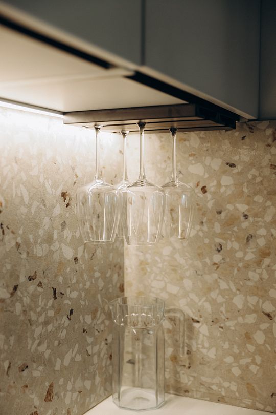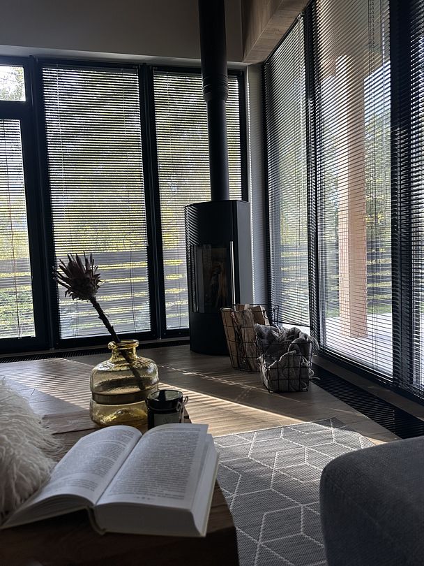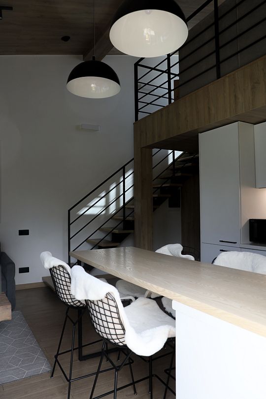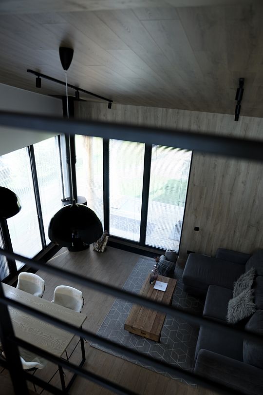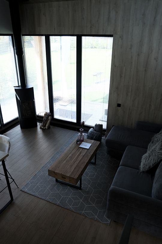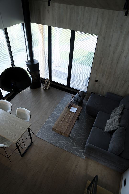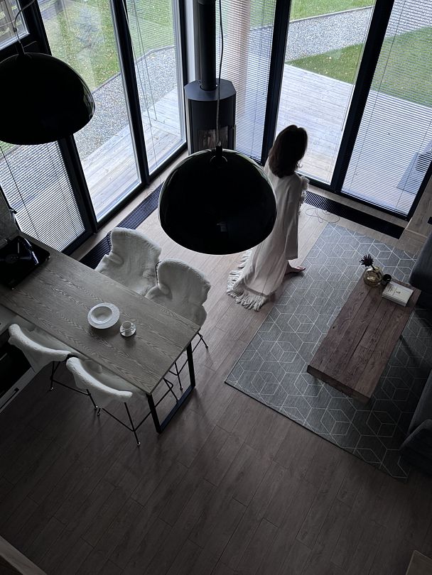 В доме находится полноценная кухня с духовым шкафом, микроволновой печью, холодильником, посудомоечной и стиральной машинами. У панорамного окна с видом на гору Селигур расположен дровяной камин. Ванная комната с тёплым полом оборудована душевой кабиной, санузлом и раковиной у окна.