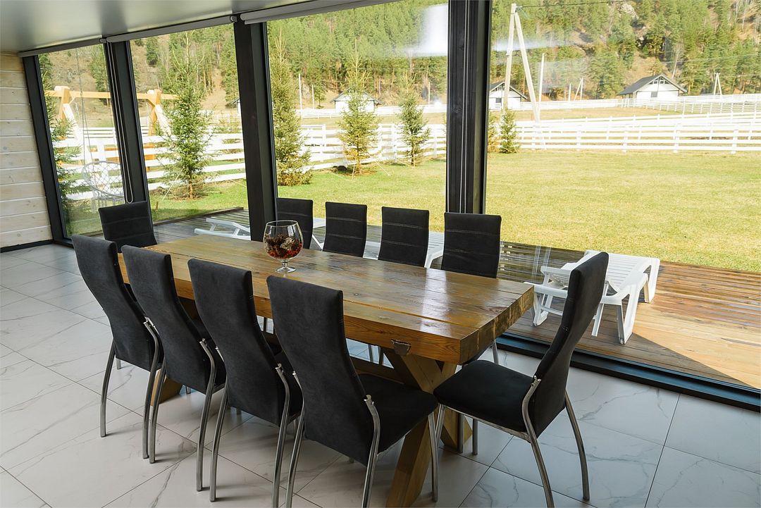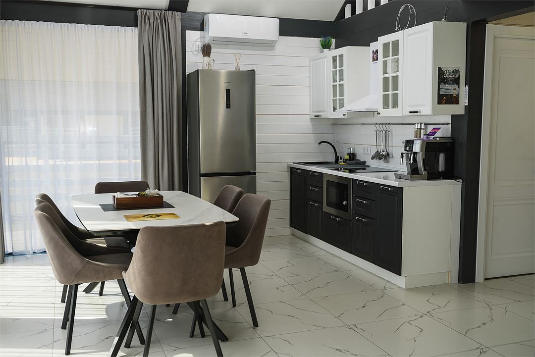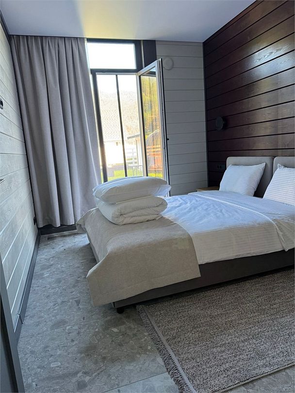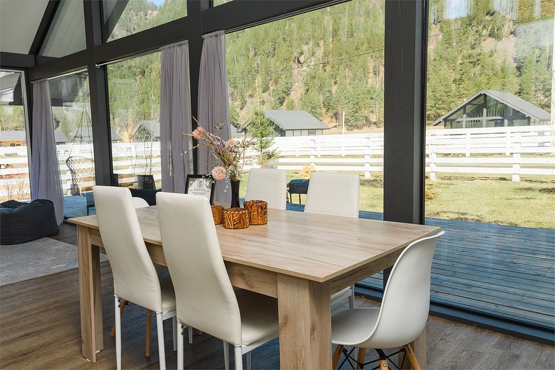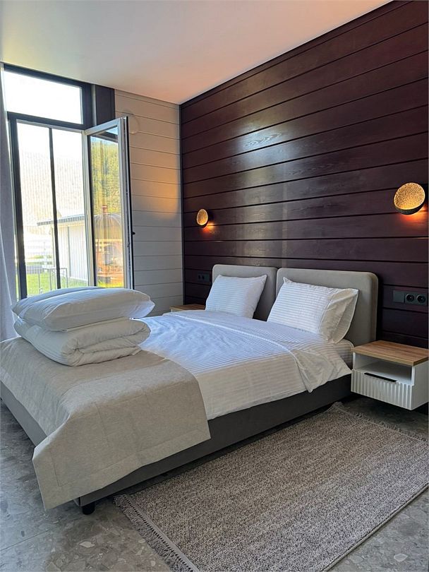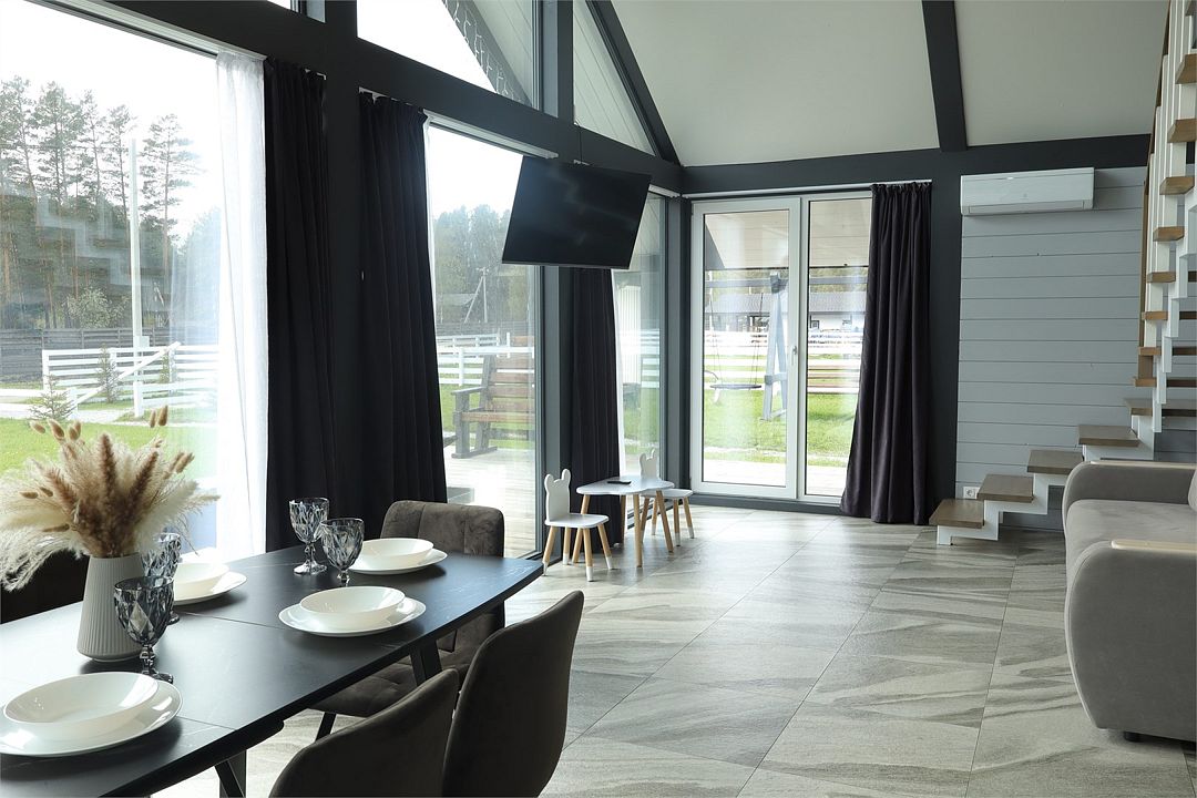 телевизор, Wi-Fi, холодильник, кондиционер, фен, плита для приготовления пищи, кофемашина, микроволновая печь, утюг, душевая кабина, теплый пол, банные полотенца, гигиенические средства, две двуспальные кровати, детская кровать, стулья, вешалки, посудомоечная машина, стиральная машина, чайник, унитаз, раковина, вид во двор, стол, диван-кровать, раскладной диван, вид на горы, стульчик для кормления ребенка, можно с питомцамиВ коттедже