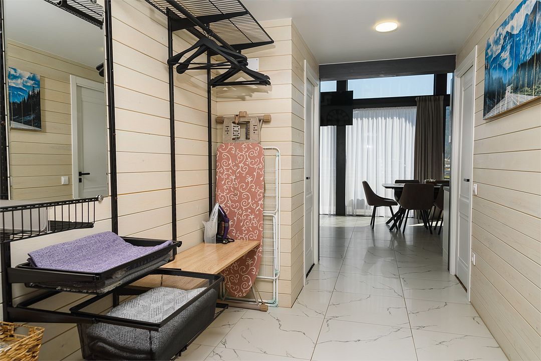 телевизор, Wi-Fi, холодильник, кондиционер, фен, плита для приготовления пищи, кофемашина, микроволновая печь, утюг, душевая кабина, теплый пол, банные полотенца, гигиенические средства, две двуспальные кровати, детская кровать, стулья, вешалки, посудомоечная машина, стиральная машина, чайник, унитаз, раковина, стол, сушилка для белья, диван-кровать, раскладной диван, вид на горы, можно с питомцамиВ коттедже