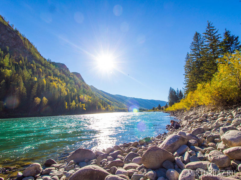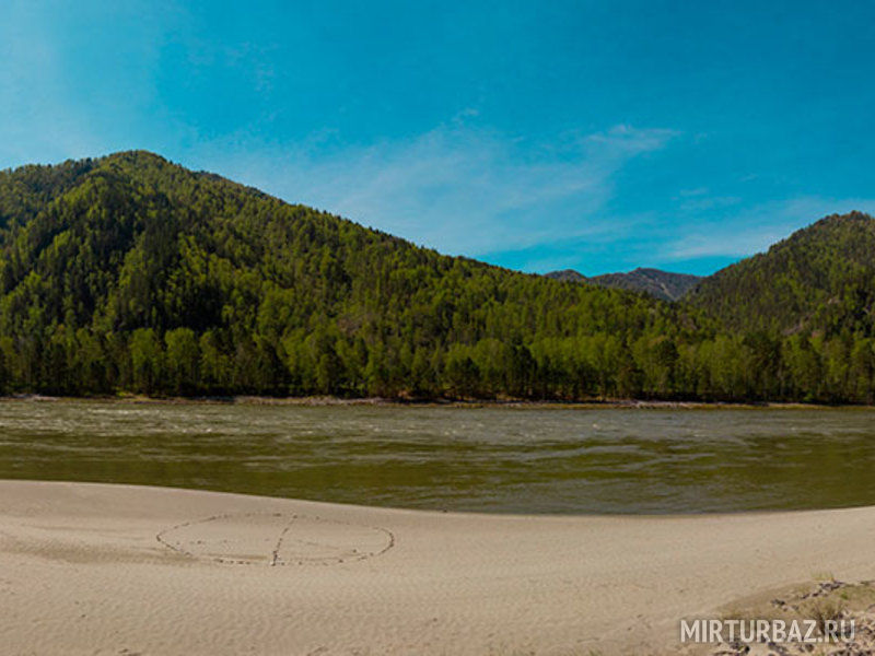 Песчаный пляж на берегу реки Катунь находится в 50 метрах от базы отдыха.