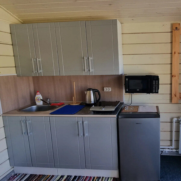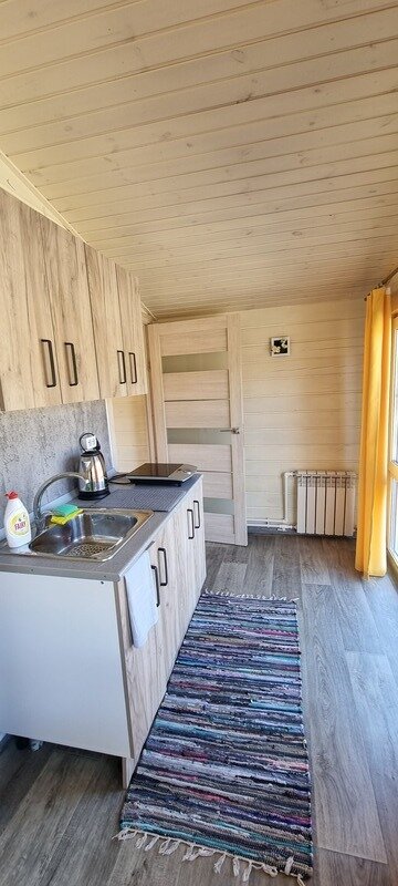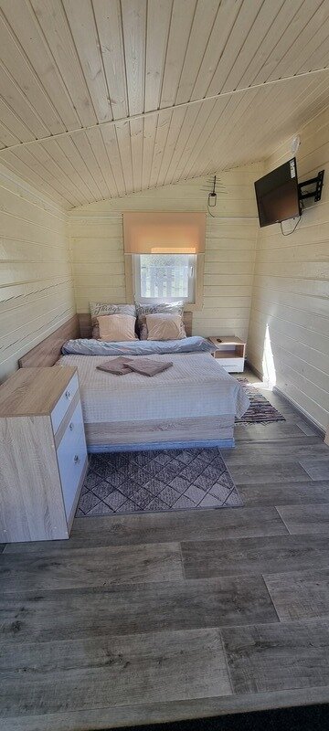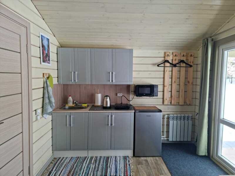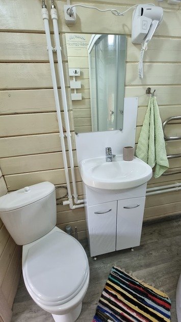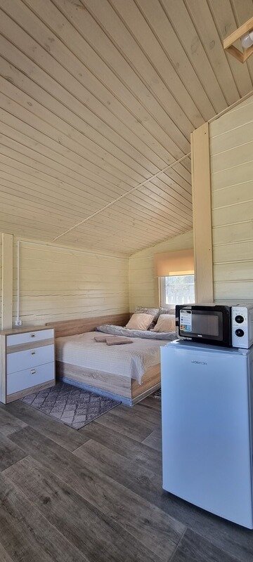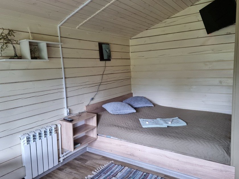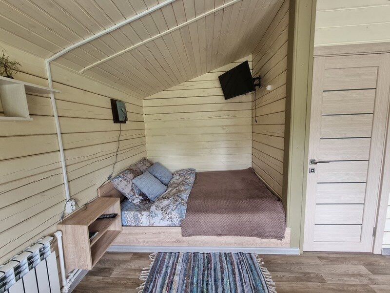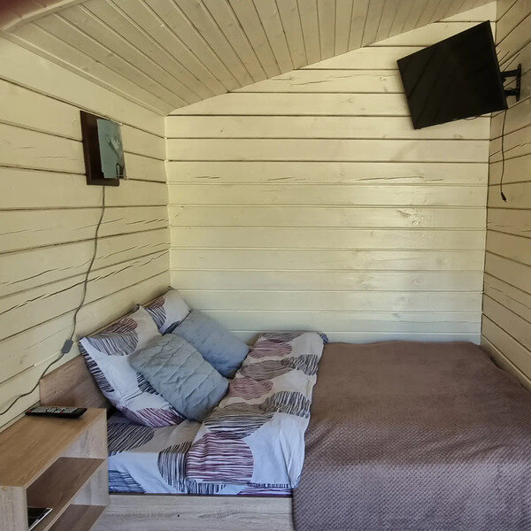 Полноценная двуспальная кровать, кресло акробат, телевизор, кухонная зона, микроволновая печь, индукционная плитка, посуда, холодильник, полотенца банные на каждого гостя, средства личной гигиены, душевая кабина, санузел.