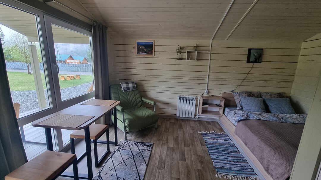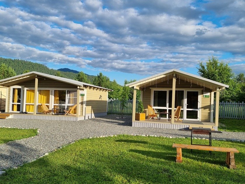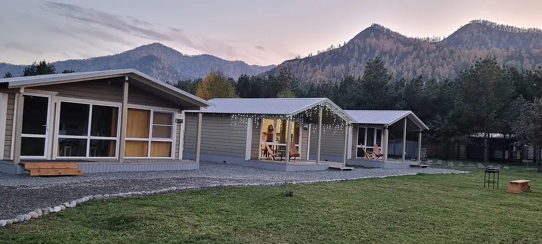 Новые уютные дома находятся среди сосен неподалёку от реки Катунь и оборудованы всем необходимым, чтобы проживание в них было комфортным и беззаботным. Панорамное остекление с выходом на террасу подарит потрясающий вид на горы. Рядом с каждым домиком есть мангал и гамак. На территории находится костровая зона и баня-бочка из алтайского кедра.