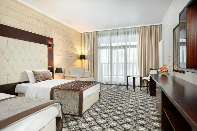 2-спальная кровать, диван, шкаф, журн.столик, ТВ, кондиционер, телефон, сейф, мини-бар, СВЧ, кулер, эл.чайник, набор посуды. С/у, душевая кабина и ванна, фен