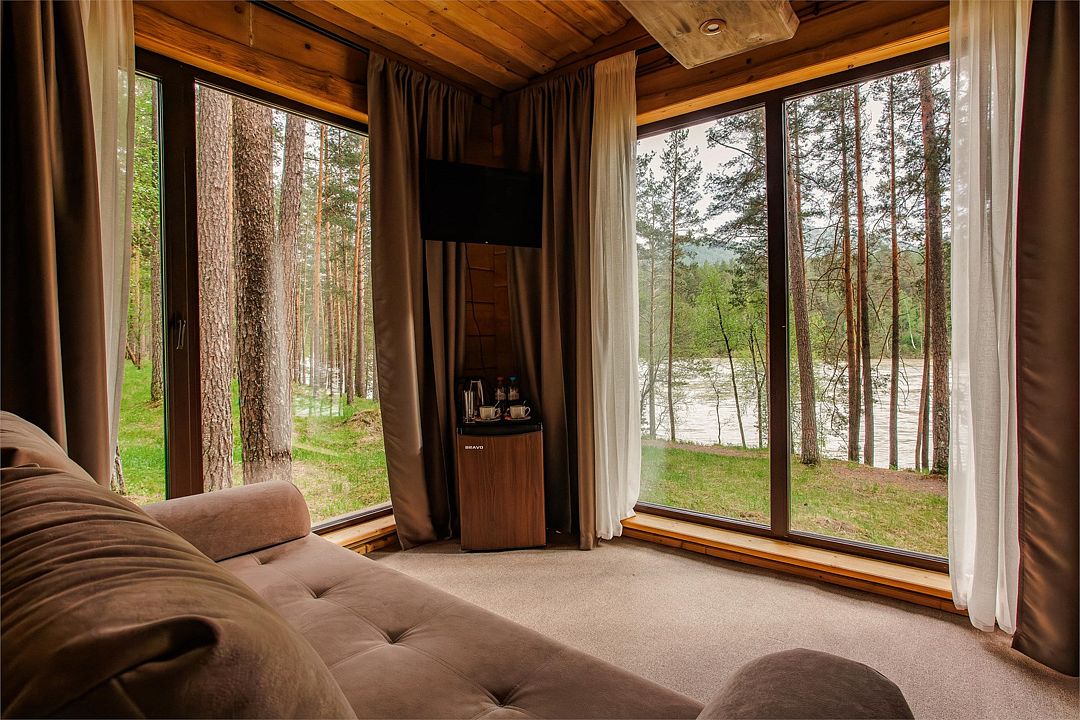 Двухэтажное шале на берегу Катуни — панорамные окна, большая личная терраса и балкон. Одна двуспальная кровать (160х200), два раскладных дивана.