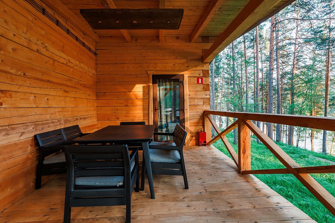 Стол для комфортного времяпровождения установлен на террасе, создавая атмосферу единения с природой.