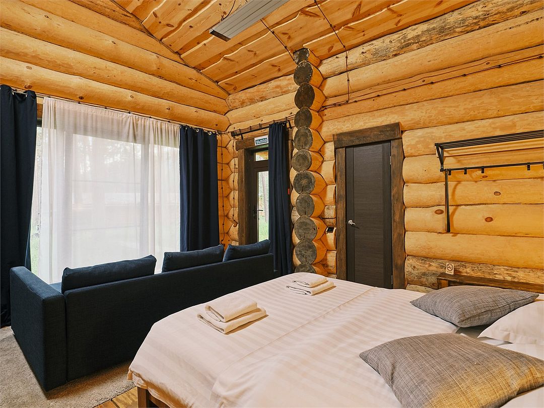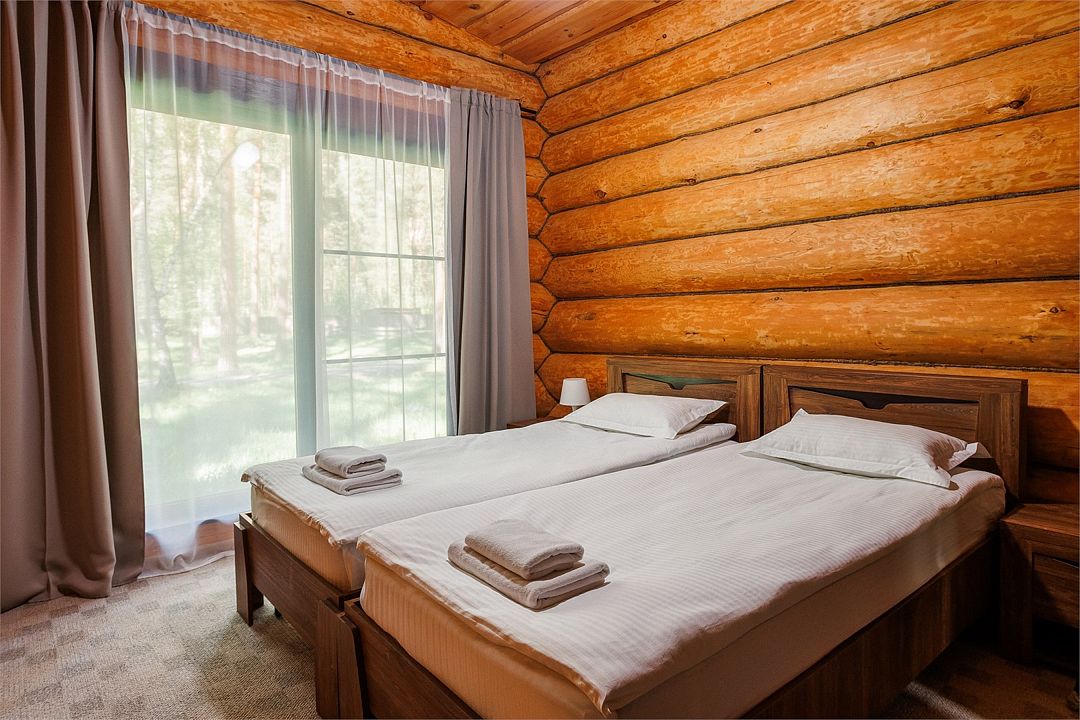Трехкомнатное шале на берегу Катуни 74 м² — панорамные окна, личная терраса. Спальня №1 — две односпальные кровати (90х200), спальня №2 — одна двуспальная кровать (160х200), в гостиной — раскладной диван (140х200).