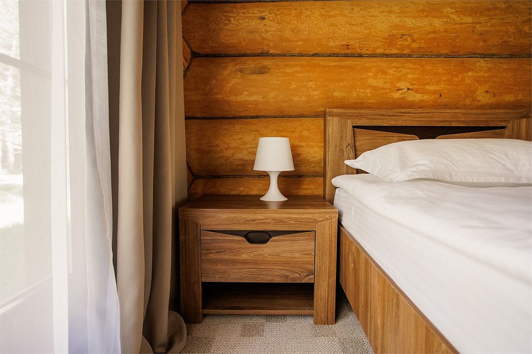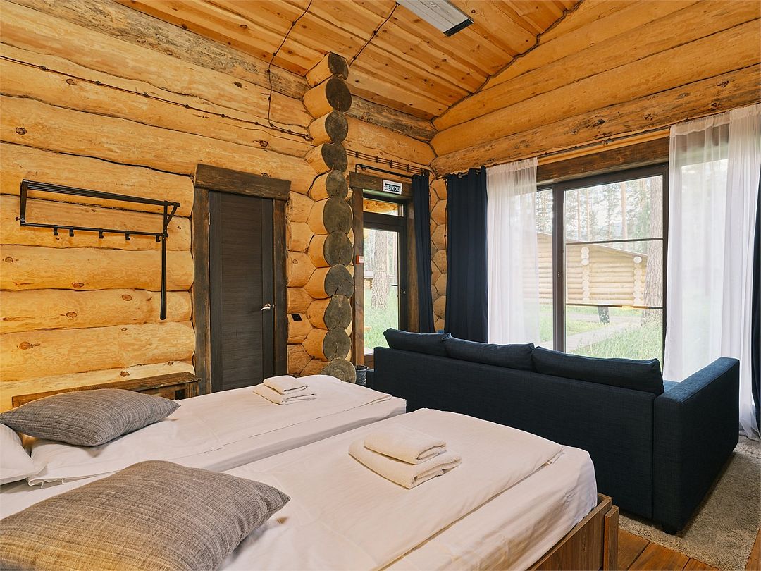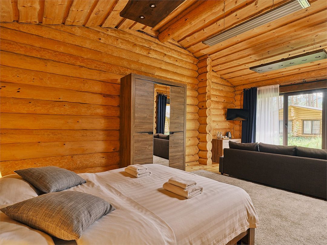 Трехкомнатное семейное шале 74 м² — панорамные окна с видом на лес, личная терраса. Спальня №1: две односпальные кровати (90х200), спальня №2: одна двуспальная кровать (160х200), в гостиной: раскладной диван (140х200).
