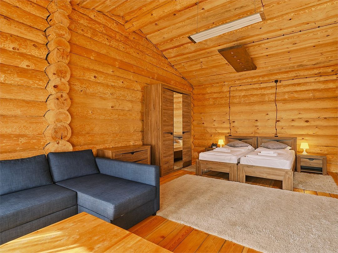 Трехкомнатное семейное шале 74 м² — панорамные окна, личная терраса. Спальня №1 — две односпальные кровати (90х200), спальня №2 — одна двуспальная кровать (160х200), в гостиной — раскладной диван (140х200).