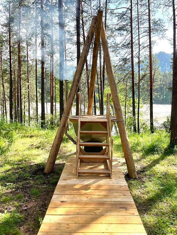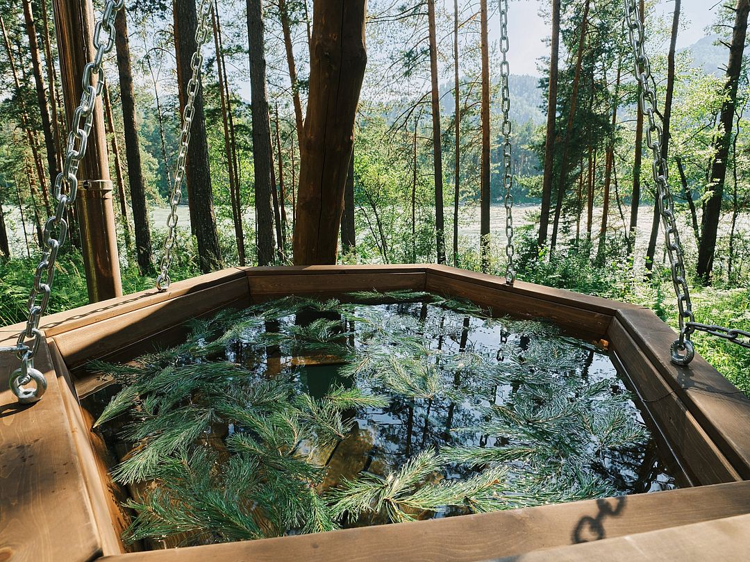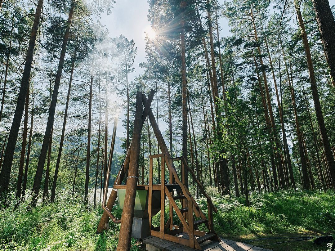 На территории расположены: качели на берегу Катуни, беседки с мангалами на берегу Катуни, спа-центр, банный комплекс с чаном и купелью, малая баня с чаном, йога-центр, детская комната и уличная детская площадка, конференц-зал / переговорная, ресторан североморской кухни в сплетении с дарами Алтая, костровая зона.