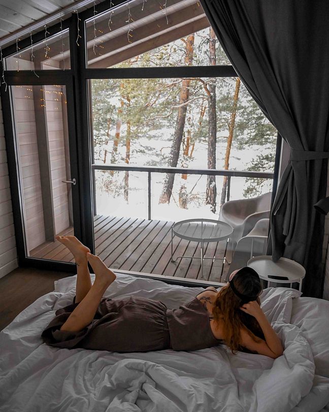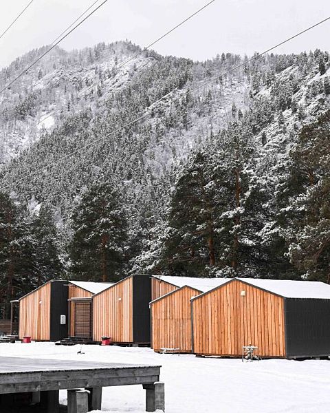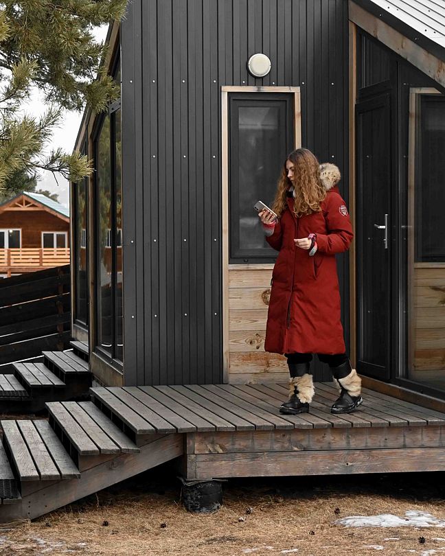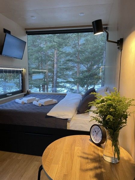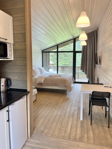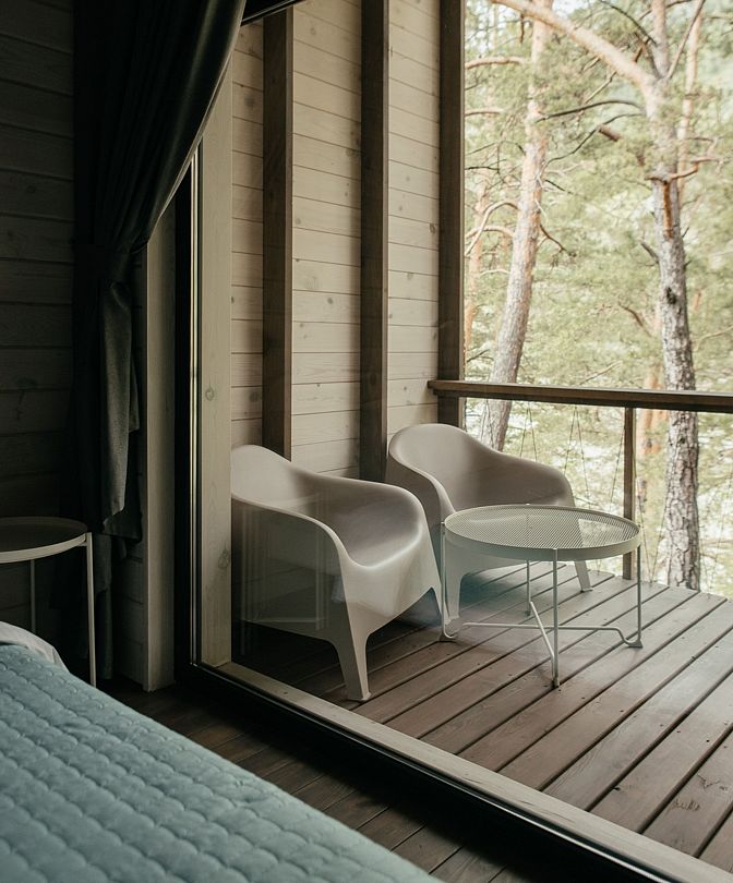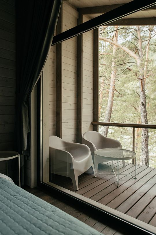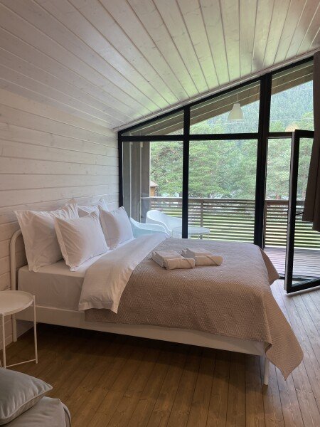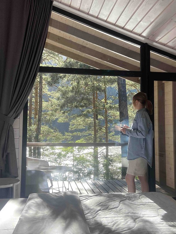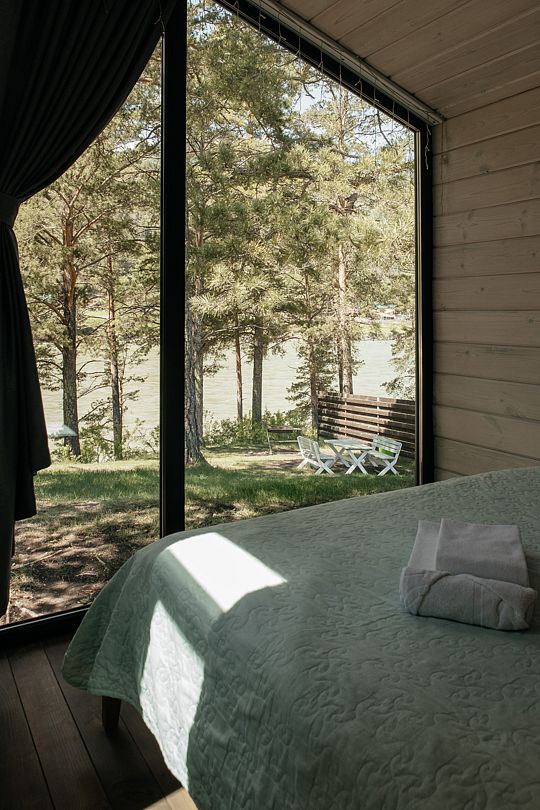 Из панорамных окон открываются потрясающие виды на нетронутые сосновые леса и захватывающие горные просторы. Здесь каждый гость может насладиться утренним кофе на террасе или просто расслабиться в теплой постели, наслаждаясь великолепными пейзажами.