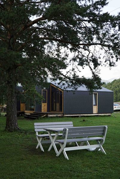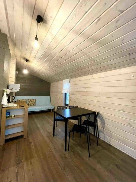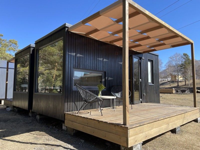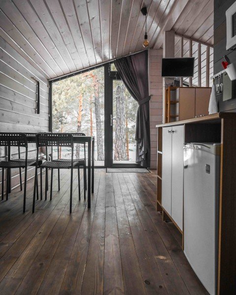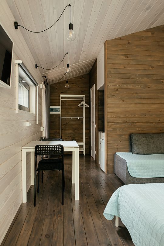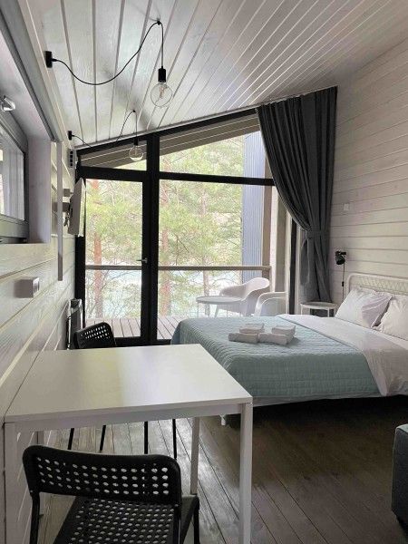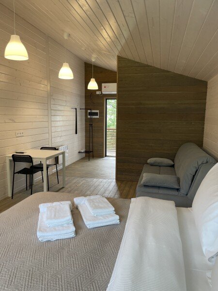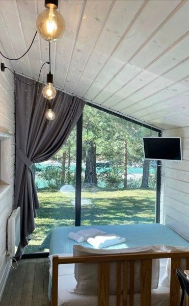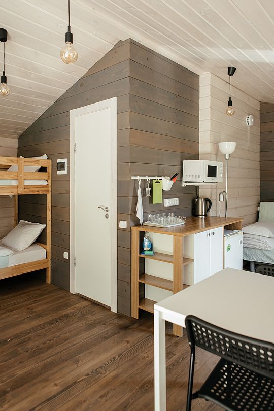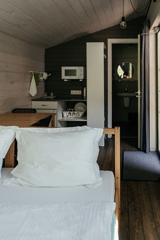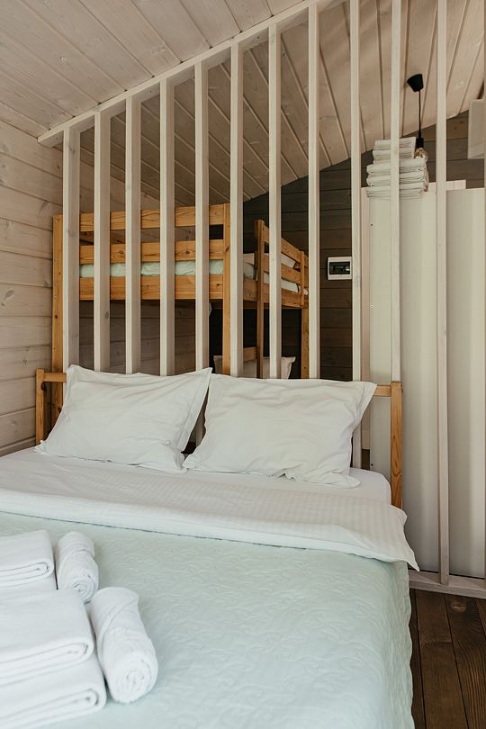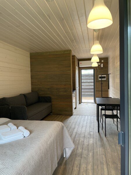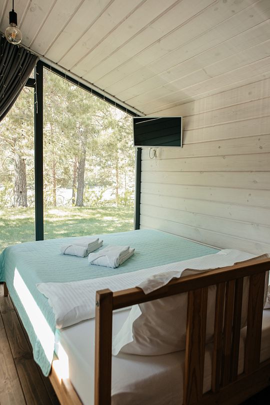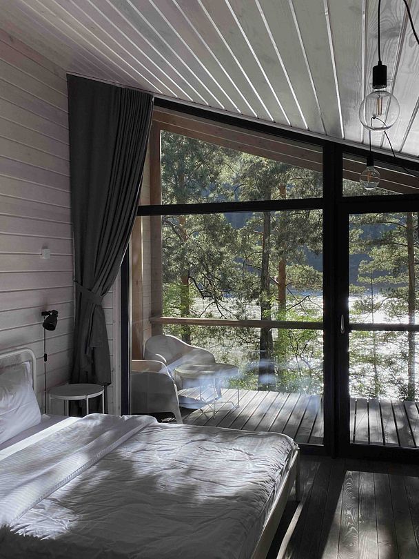 Глэмпинг предлагает четыре стиля домиков, расположенных на первой береговой линии. Интерьеры выполнены в дизайнерском стиле с использованием натурального дерева, что создает атмосферу тепла и домашнего уюта.