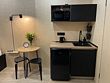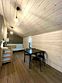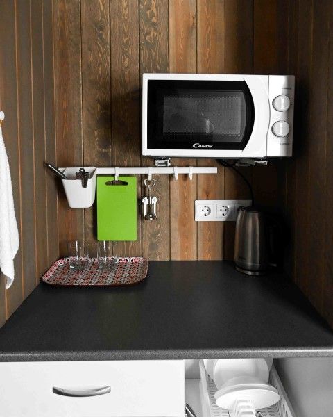 Посуда — 4 предмета на персону, столовые приборы, нож, разделочная доска, стаканы, кружки, штопор. В санузле теплый пол, тапочки, фен, шампунь, гель для душа, зубной набор.
