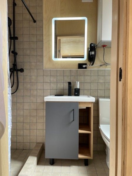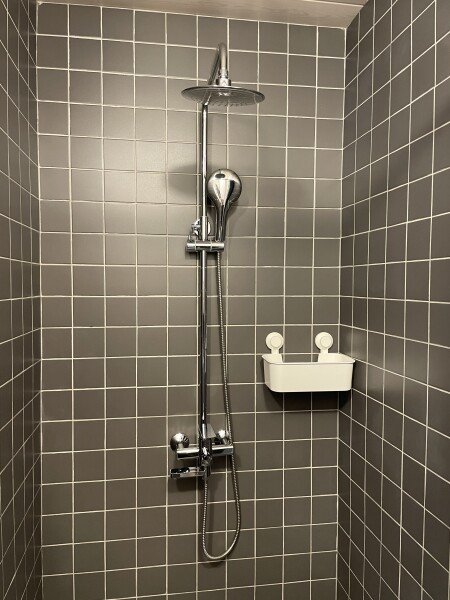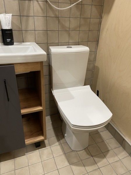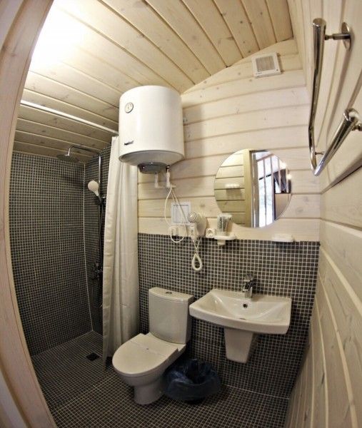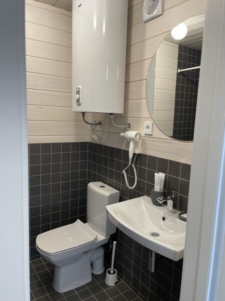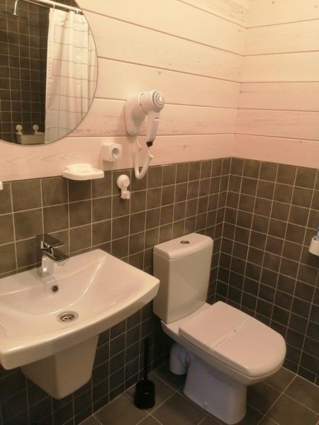 В санузле — теплый пол, тапочки, фен, шампунь, гель для душа, зубной набор.