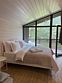 Уютный домик с панорамным окном для двоих, с террасой и садовой мебелью. В доме двуспальная кровать, полотенца, телевизор. На кухне микроволновая печь, электрочайник, холодильник.
