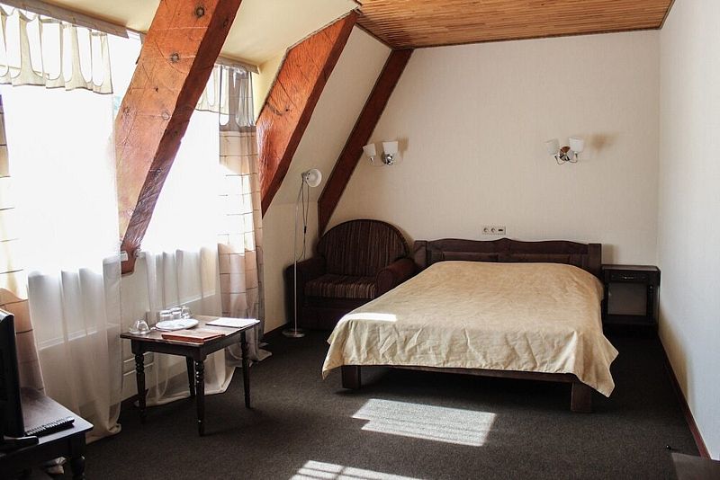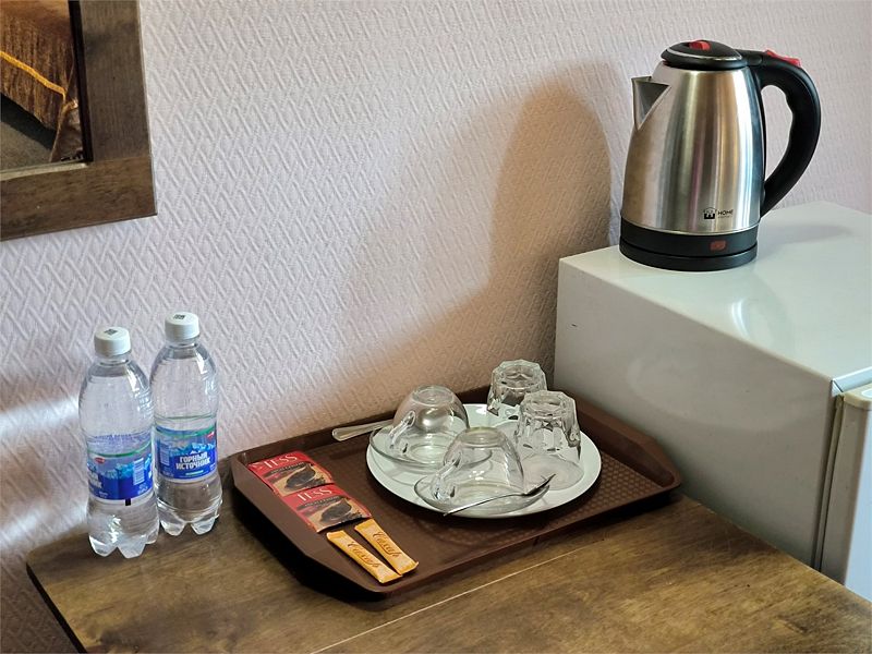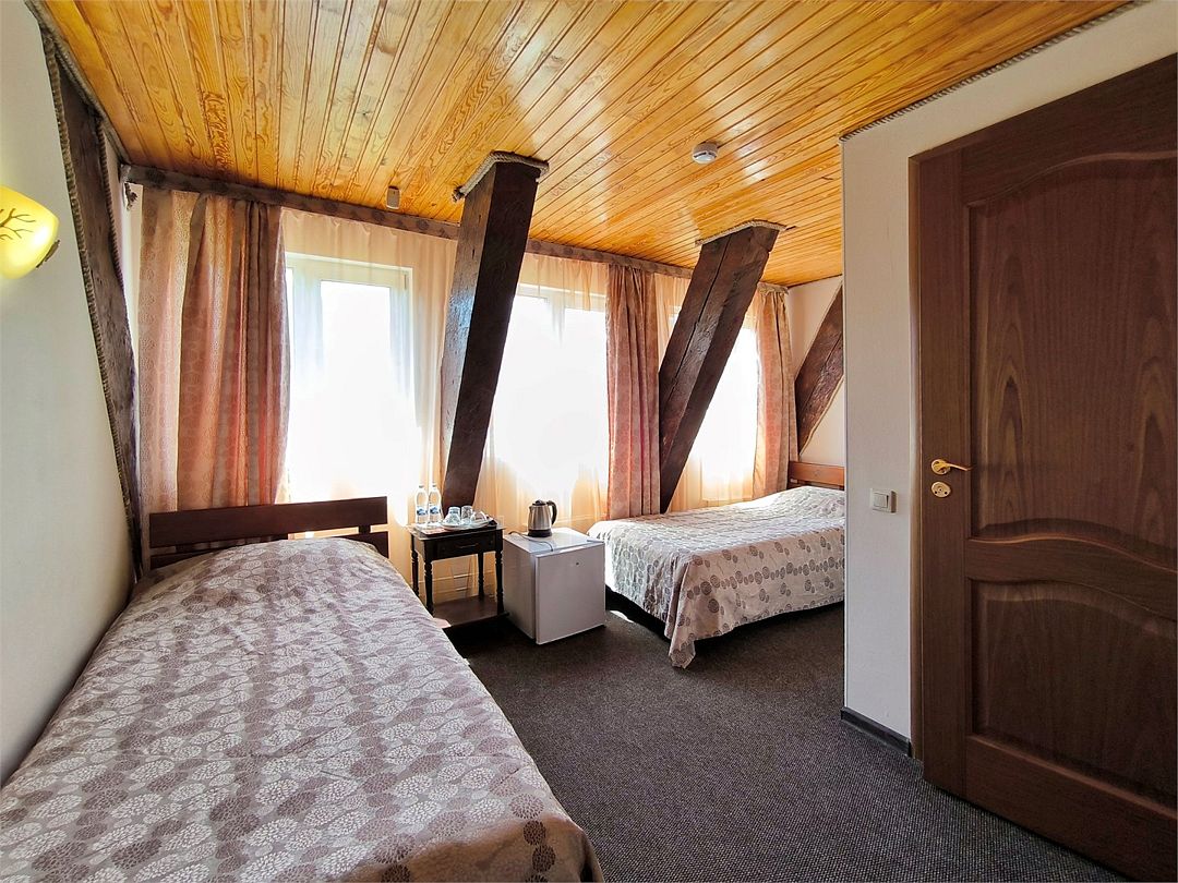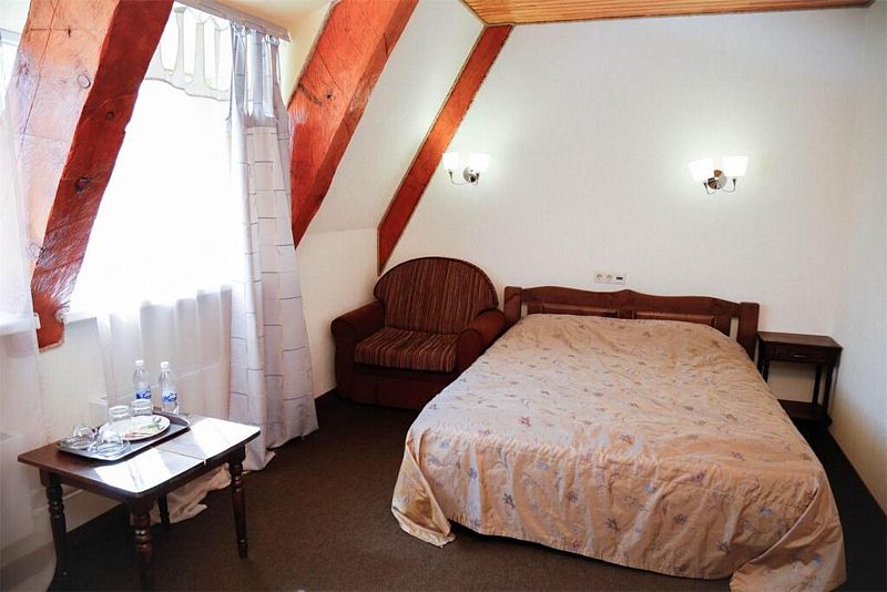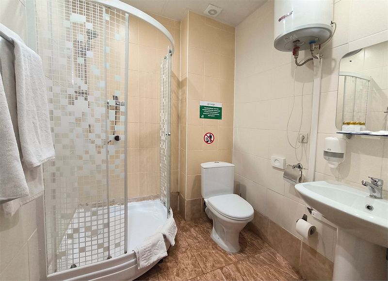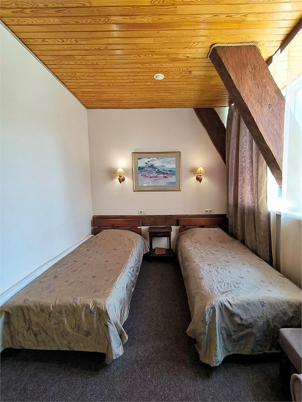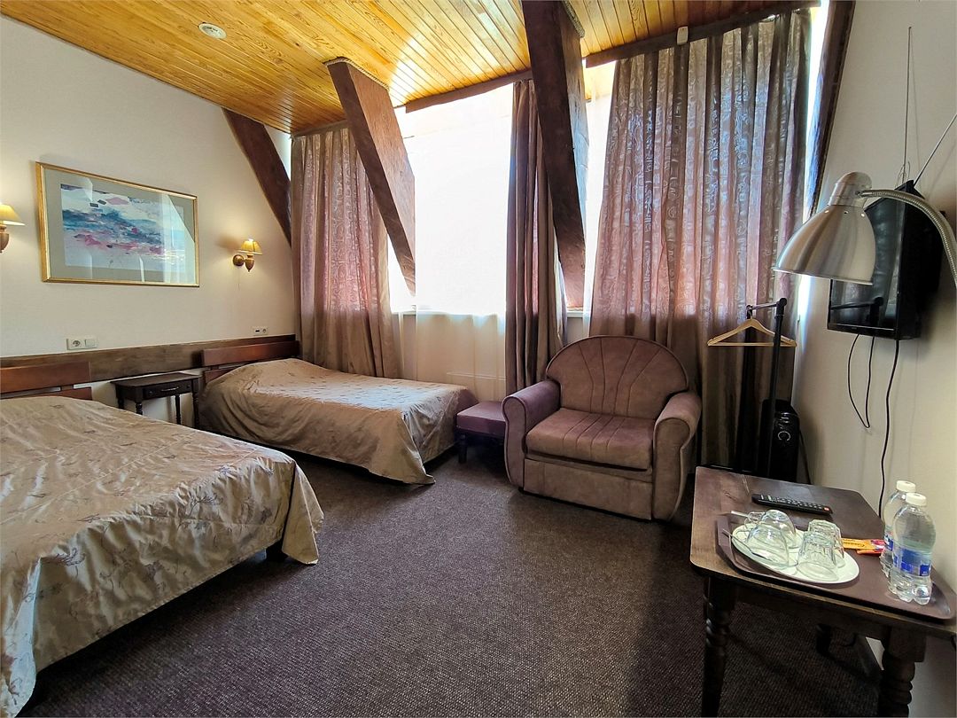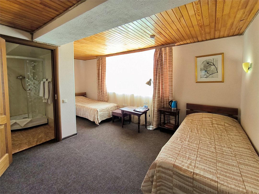 Однокомнатный номер от 15 кв.м. В номере: две раздельные кровати, прикроватные тумбы, вешалка, столик, телевизор, чайные пары. Санузел: унитаз, душевая кабина. В стоимость включены завтраки на 2-х человек.Услуги и удобства