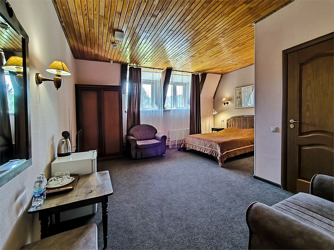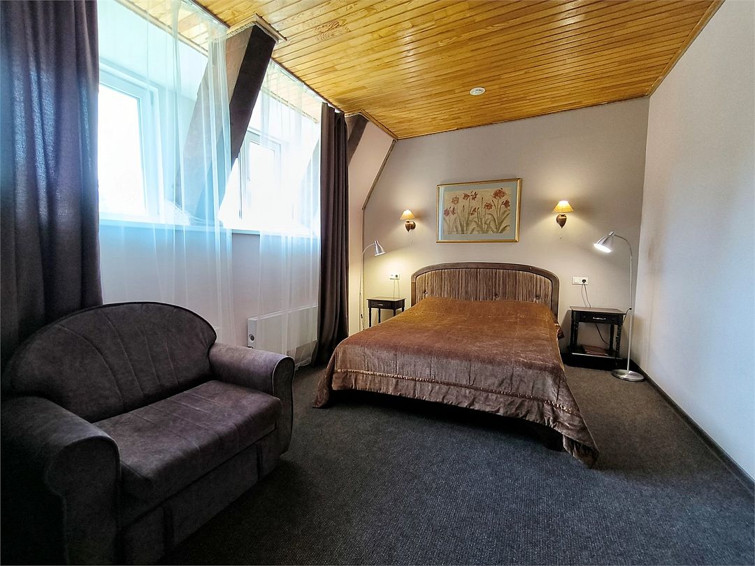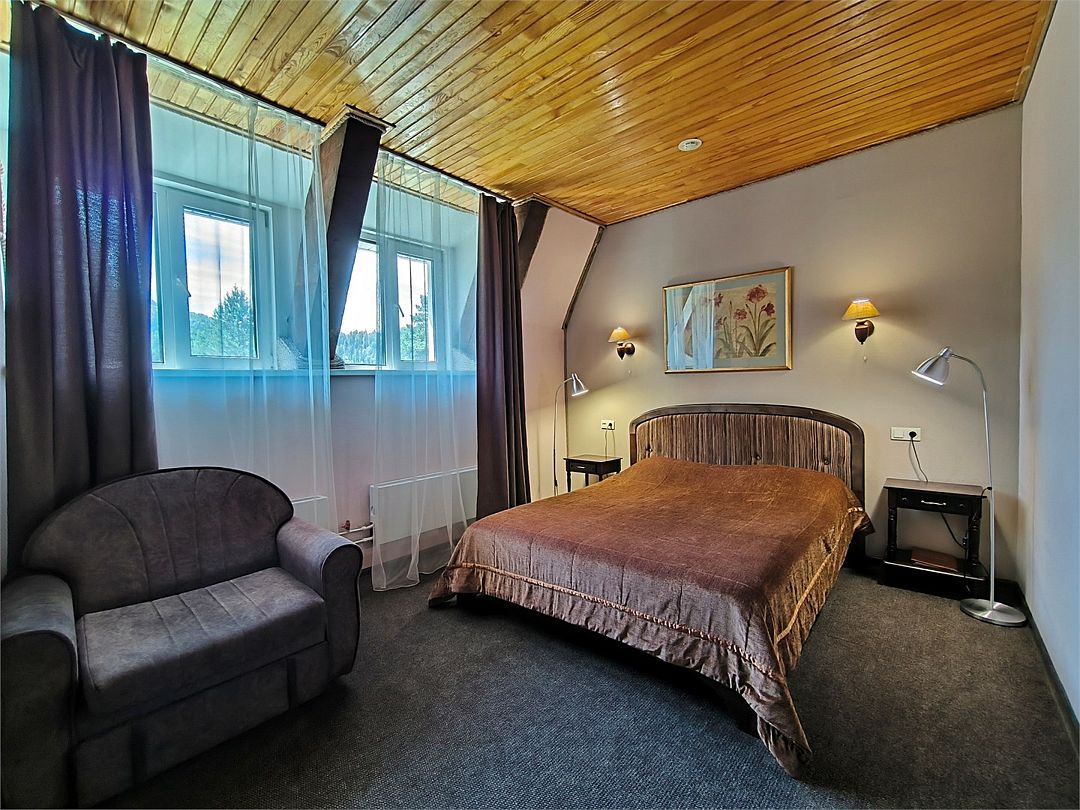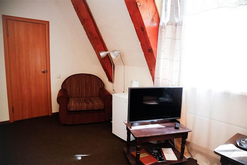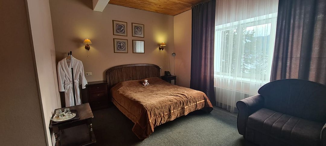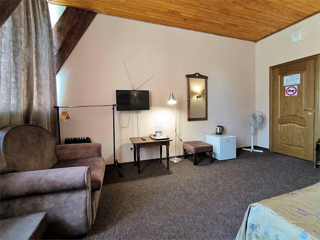 Однокомнатный номер от 27 кв.м. В номере: двуспальная кровать, прикроватные тумбы, вешалка, столик, телевизор, холодильник, чайные пары. Санузел: унитаз, душевая кабина. В стоимость включены завтраки на 2-х человек. Дополнительное место: раскладное кресло-кровать.Услуги и удобства