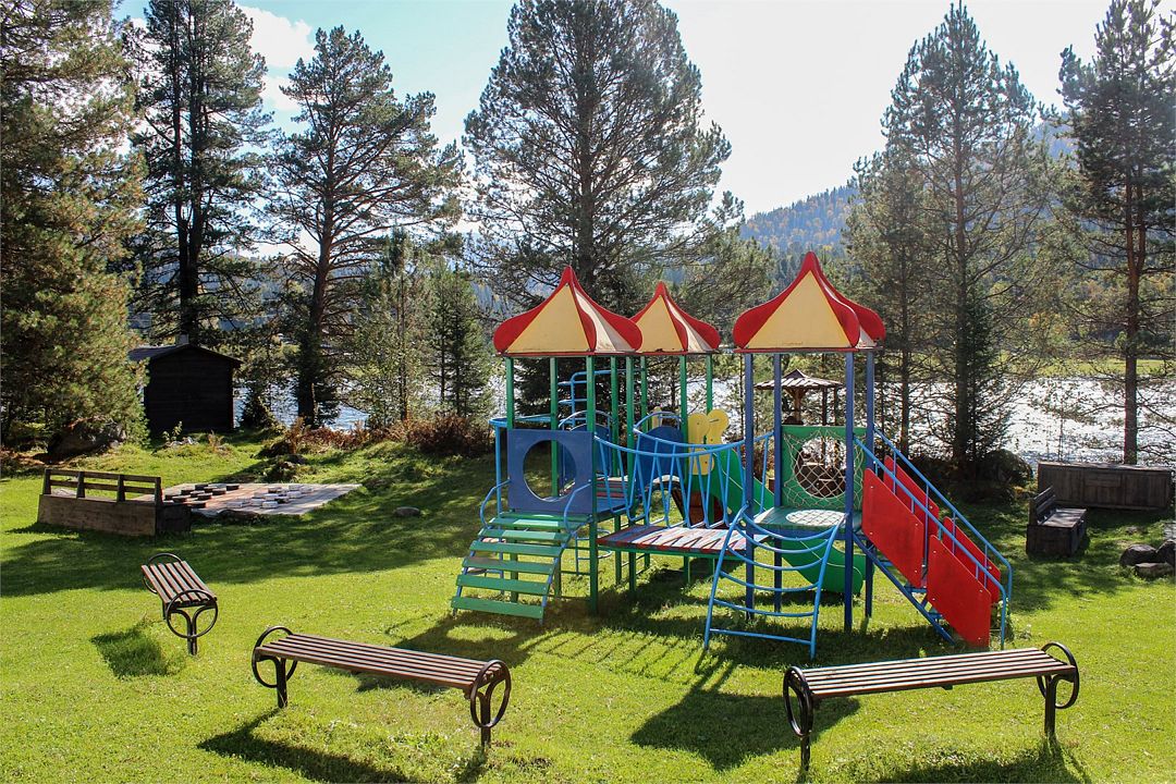 Открытый бассейн для взрослых и детей с великолепным видом на горы и реку установлен на территории комплекса, рядом с детской площадкой.