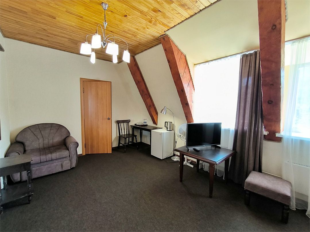 Гостиная: мягкая мебель, ТВ, вешалка, зеркало, пуфы, журнальный столик. Спальня: двуспальная кровать или две односпальные кровати, комод, холодильник, чайные пары. Санузел: унитаз, ванна или душевая кабина В стоимость включены завтраки на 2-х человек. Дополнительное место: раскладная двухместная софа.Услуги и удобства
