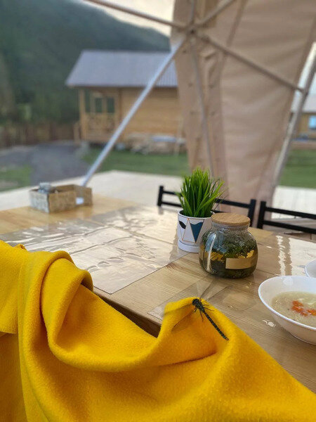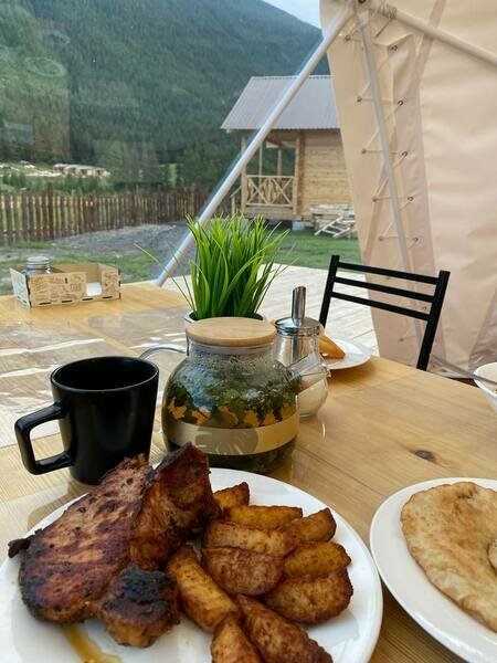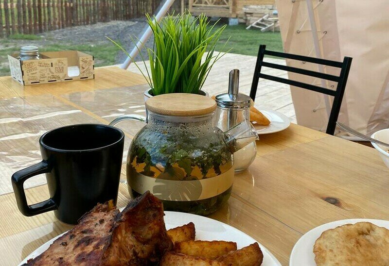 На территории базы отдыха расположено стильное купольное кафе, где представлены блюда тюркских народов, так же имеются традиционные привычные блюда русской кухни.