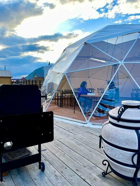 На территории расположено купольное кафе, где представлены блюда тюркских народов, также имеется традиционная привычная русская кухня. Для приготовления многих блюд используются тандыр и мангал, поэтому меню кафе не оставит никого равнодушным. Кроме того, в кафе большой ассортимент напитков, для любителей кофе имеется кофемашина, чтобы в любое время гости могли насладиться вкуснейшим свежесваренным кофе.