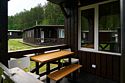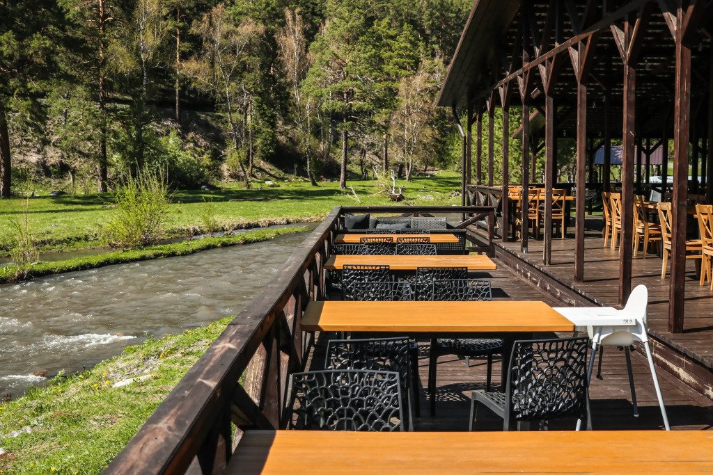 В теплые дни вы можете расположиться на террасе кафе возле реки с великолепным видом на горы.