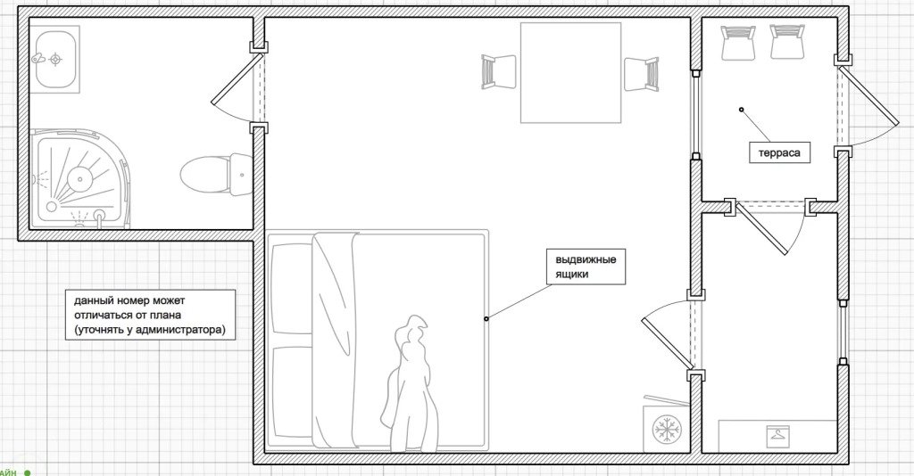 Номерной фонд включает 49 уютных и современных номеров с отдельным входом, крытой террасой и всеми удобствами. В каждом номере установлены ортопедические матрасы и постельное бельё премиум-класса.