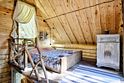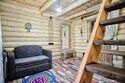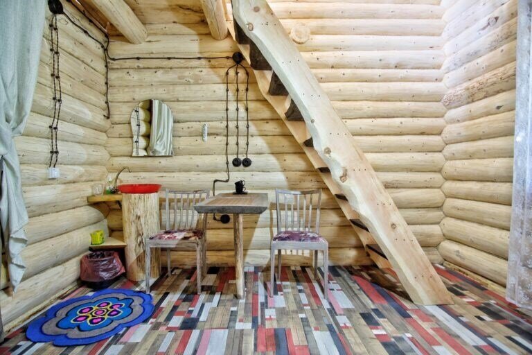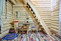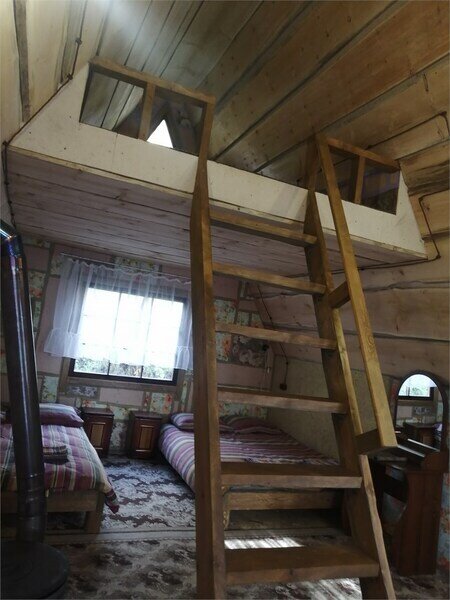 Двуспальная кровать из массива дерева на чердаке, грубая деревянная мебель, самодельные перила лестницы, и имитация домотканых половичков помогут прочувствовать атмосферу настоящей лесной избушки.