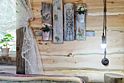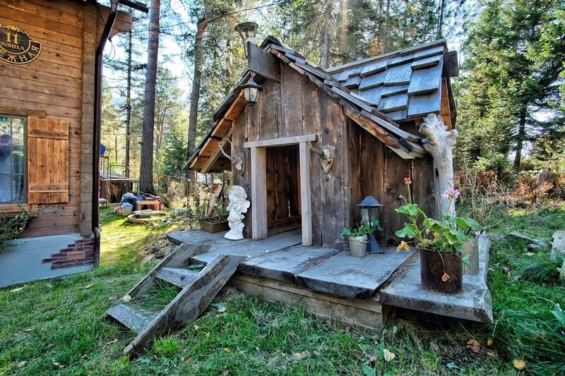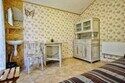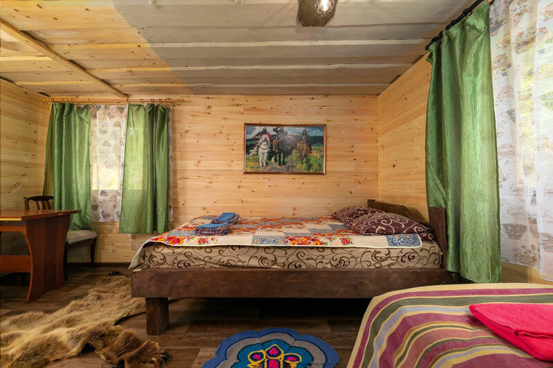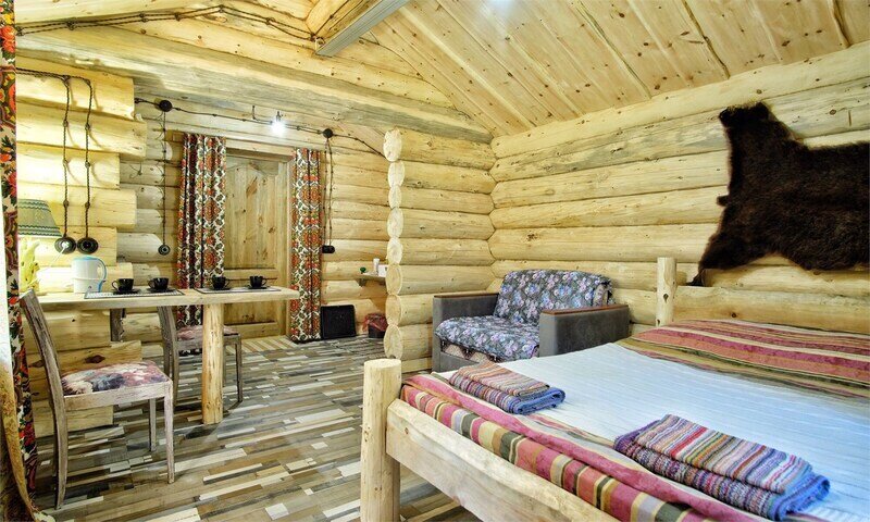 Двуспальная кровать из массива дерева, грубый деревянный стол и стулья, шкура медведя на стене, имитация домотканых половичков и покрывала помогут прочувствовать атмосферу настоящей лесной избушки. На окнах пестрые занавески и цветы в горшках.