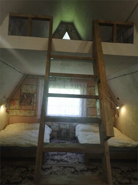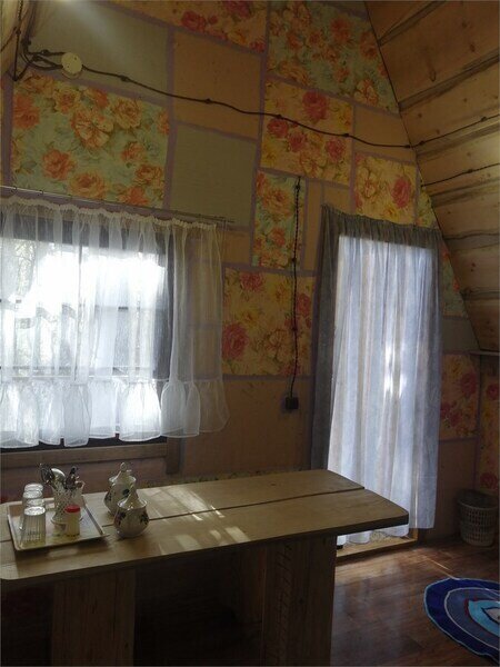 На первом этаже помимо дивана есть столик, два стула, раковина с зеркалом и старинное трюмо. Электрический чайник, чашки с блюдцами, фен. Предусмотрено отопление.