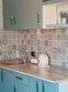 Кухонная зона: гарнитур, гор./хол. вода, посуда, чайник, холодильник.