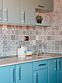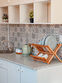 Обеденная зона: стол, диванчик, холодильник, шкаф с посудой, чайник.