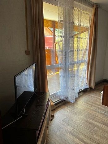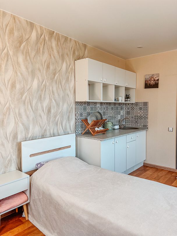 Кухонная зона: гарнитур, гор./хол. вода, посуда, чайник, холодильник. Душ и туалет в коридоре.