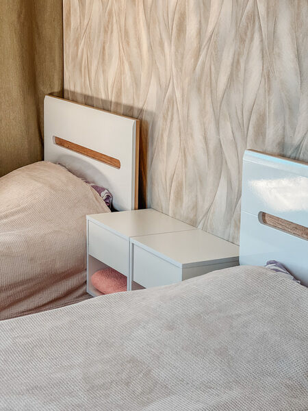 - двуспальная кровать, раскладной диван, комод, тумбочки, ТВ;