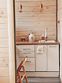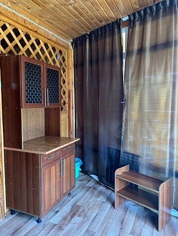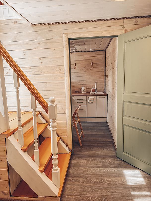 В домике на первом этаже находится прихожая, кухня, душ и туалет, а на втором этаже — две раздельные спальни. Кухня (гарнитур, посуда, плита), санузел (туалет, душевая кабина), 2 комнаты: