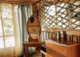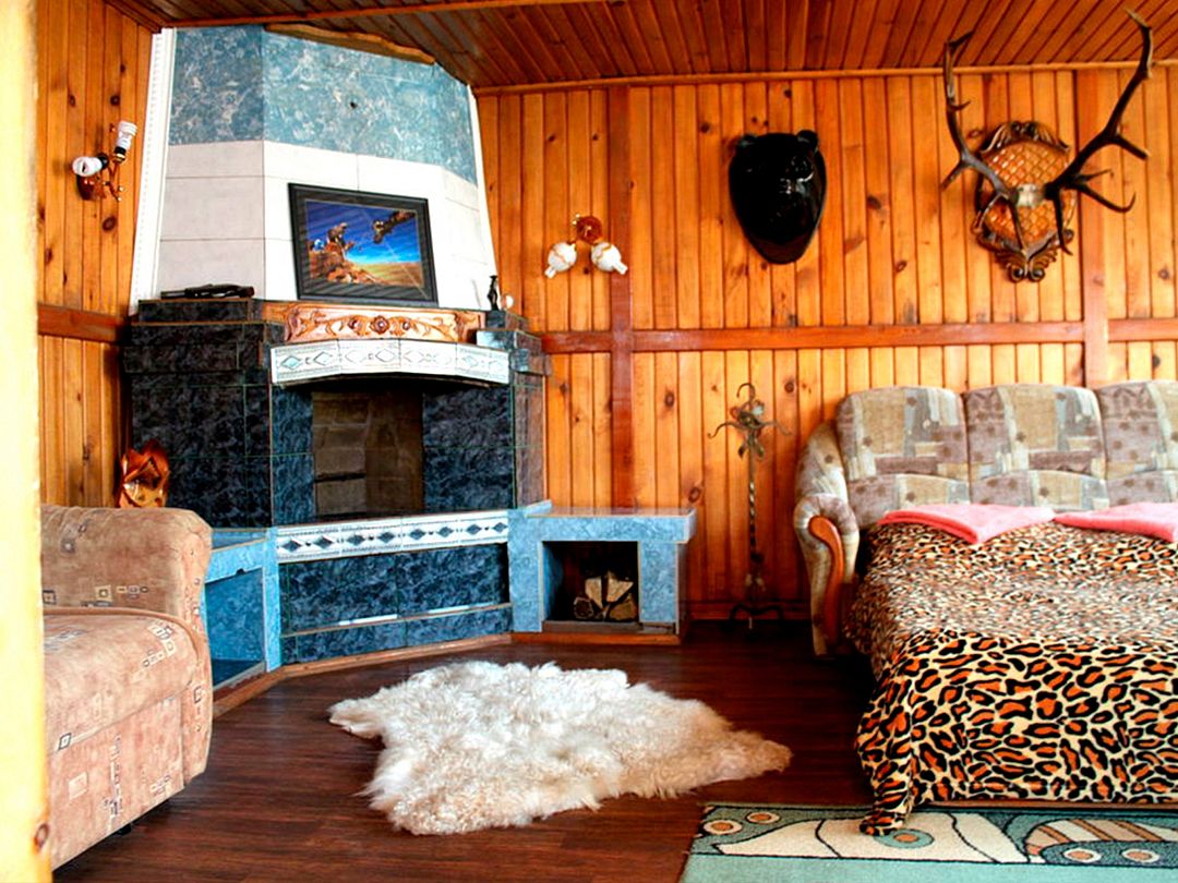 Домик в охотничьем стиле, с собственным камином. Рядом находится круглый бассейн.