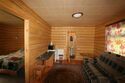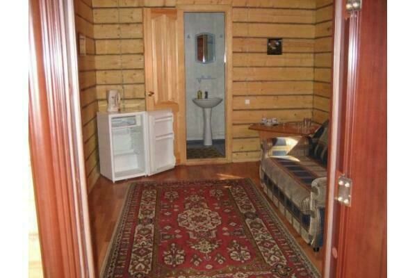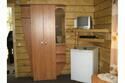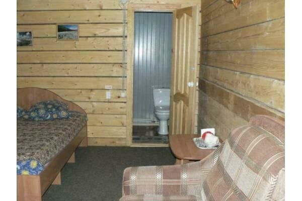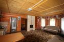 Двухуровневый номер в корпусе «Аржан» с каминным залом, отдельно оборудованной кухней и двумя санузлами. 1 этаж: прихожая - шифоньер, зеркало, кресло; каминный зал - 2 кресла-качалки, 2 дивана, стол + 4 лавки, стенка; кухня, туалетная комната. 2 этаж: спальня - двуспальная кровать, кресло, тумбочки, журнальный стол, вешалка, балкон, туалетная комната.