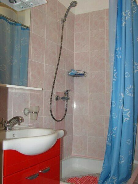 Номер оборудован санузлом, в котором находятся раковина, зеркало, унитаз, душ.