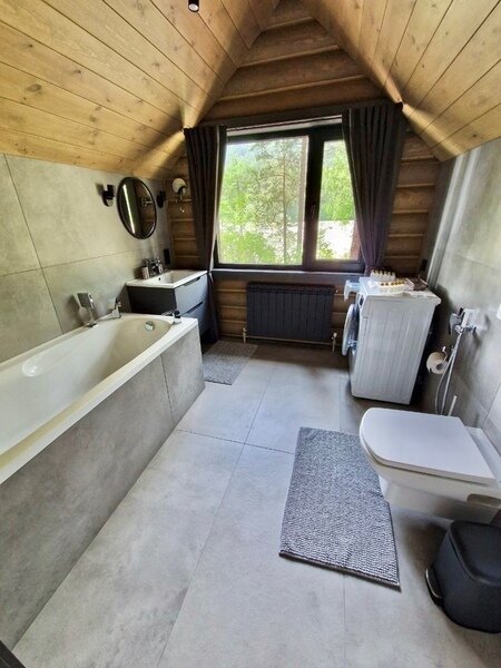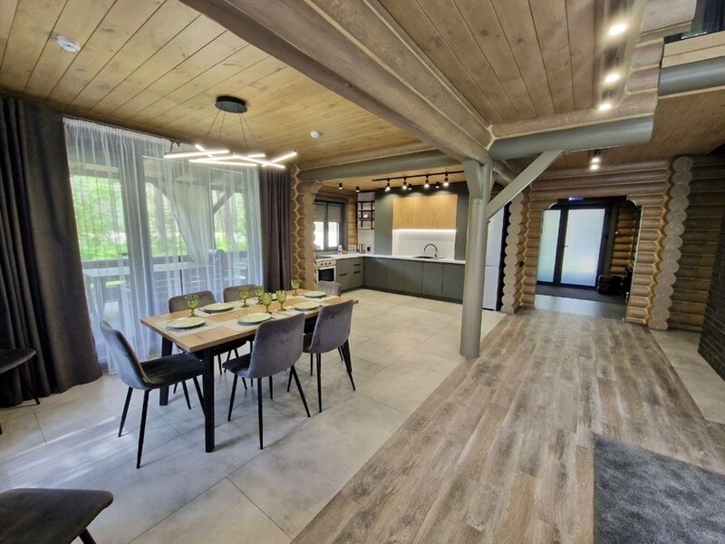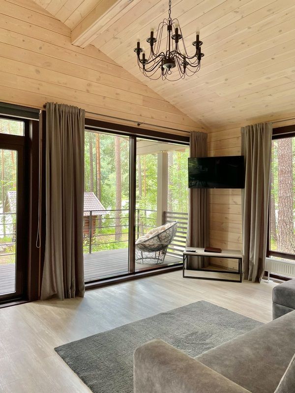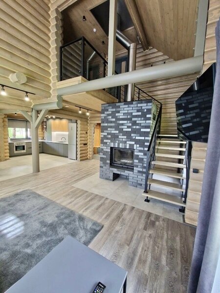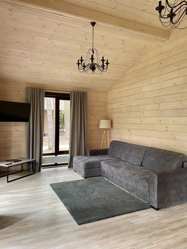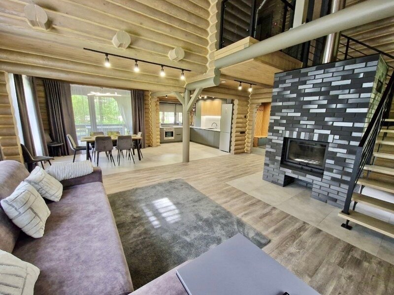 Двухэтажный коттедж. Три спальные комнаты с двуспальными кроватями. Гостиная, телевизор, раскладной диван, камин, оборудованная кухонная зона, два с/у с ванной и с душевой.