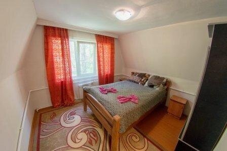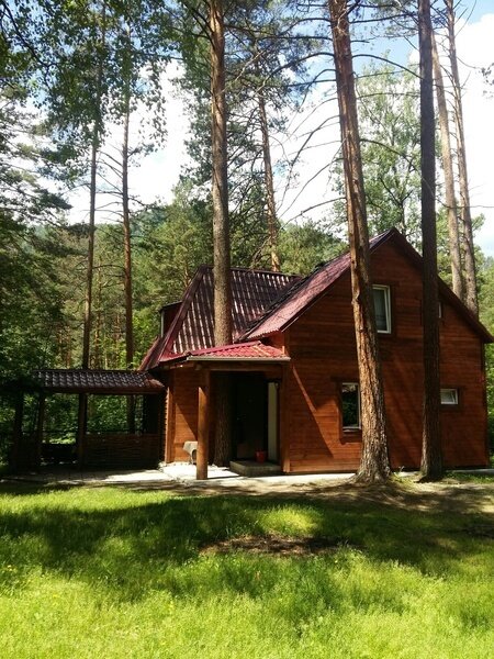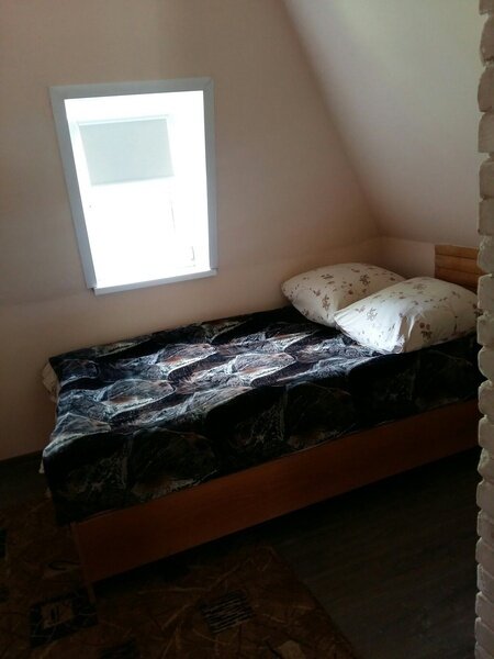 На первом этаже располагается 2 комнаты, зона кухни (холодильник, чайник, микроволновая печь), WC+душ; на втором этаже 3 комнаты и WC. Около домика зона отдыха: беседка, мангал.