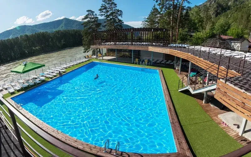 Тип бассейна: открытый бассейнРядом с бассейном: шезлонги, зонтики, бар у бассейнаВремя работы: от 10:00 до 20:00Величественный панорамный бассейн отеля «Царская охота» — настоящая жемчужина на фоне живописного пейзажа горных вершин и извилистой реки. Наполненный кристально чистой водой, стекающей с высокогорных источников Алтая, и оснащенный современной системой очистки, он создает эффект бесконечного простора — словно бы растворяясь в бескрайних далях гор и водной глади. Расслабившись в шезлонгах и закутавшись в полотенца, гости могут насладиться сервисом VIP-зоны и освежающими напитками из бара, сопровождая все это созерцанием величественного горного пейзажа.