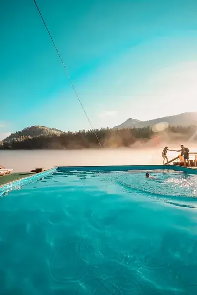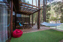 Соседний бассейн не уступает своему панорамному собрату по красоте и комфорту. Зеркальная гладь этого водного оазиса отражает великолепие окружающих пейзажей, словно приглашая окунуться в беспредельность горных далей. Рядом с бассейном расположена зона отдыха с шезлонгами и зонтиками.