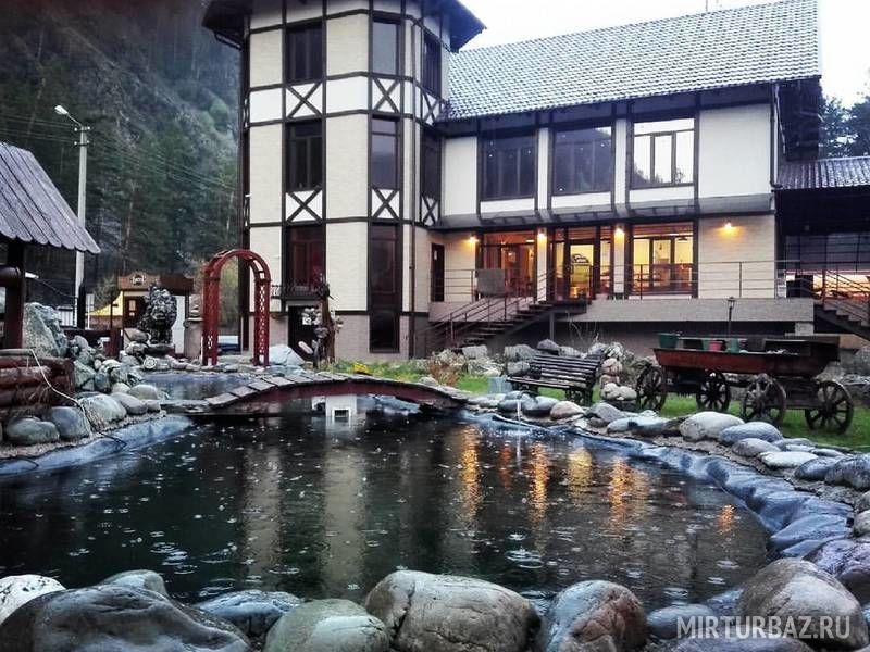Туркомлекс на двух берегах Царская охота — это популярное место в Горном Алтае, свой мост - самый короткий путь на водопад, 2 бассейна, кафе с террасой. Имеется также панорамный вид на Катунь.